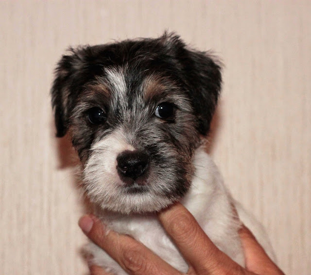 Marlon vaikuttaa hyvin seesteiseltä ja tyytyväiseltä pikku-nassikalta, joka osaa ihanasti hassutella ja pelleillä. Marlon on ollut oma suosikkimme aivan syntymästään saakka. Ihana pikku-pelle. Marlon on ollut koko ajan porukan ehdottomasti helpoin kuvattava ja seisotettava, joka näyttäisi tykkäävän pöydällä seisomisesta - lupaa hyvää näyttelyuraa ajatellen! Marlon tuntuu pönöttävän paikallaan vaikka maailman tappiin, ihan niin kuin äitinsä Mimi ja isoäitinsä Nekku! Marlonissa tuntuisi olevan kaikki ne osatekijät läsnä, joita itse pidän tärkeänä. Jään todella mielenkiinnolla seuraamaan Marlonin kasvua ja kehitystä. Marlonin luonne vaikuttaa aivan ihastuttavalta, ja odotan Marlonin kasvavan kompaktin kokoiseksi urosparsoniksi. Turkki on erittäin hyvä, ja tulee olemaan vahva broken tai karkea. Mittasuhteet, kulmaukset, selkä- ja kaulalinja sekä etuosa saavat minut melkein huokaisemaan tyytyväisyydestä, ja liikkeetkin ovat kauniit. Poika myös kantaa itsensä kauniisti. Tosin näin näyttäisi olevan jokikisen pojan kohdalla - kaikilla tuntuisi olevan potentiaalia ihan mihin vain!